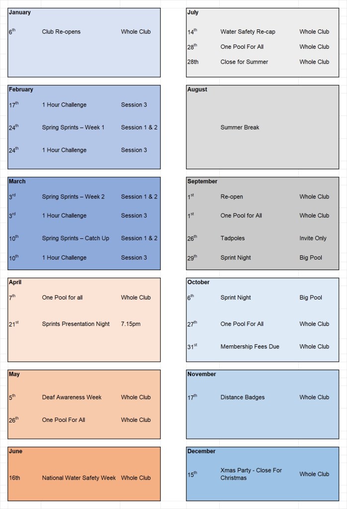 ive event for boys and girls – 8 and under, 9 & under, 10 to 15 & over age groups in three stokes, Breaststroke, Backstroke and Freestyle. Gold, Silver and Bronze medals for the fastest times. Held in February and March.